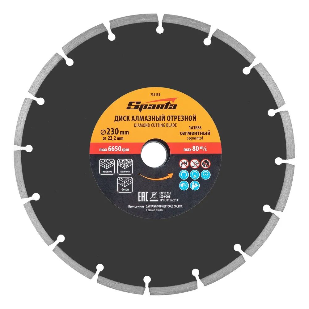Диск алмазный отрезной сегментный Sparta 731155, 230 х 22,2 мм, применяется для сухой резки бетона, камня, шлакоблока, тротуарной плитки и кирпича. Устанавливается на углошлифовальные машины с посадочным диаметром 22,2 мм. Оптимален для решения бытовых задач. Благодаря высокому рабочему ресурсу диск подходит для интенсивной работы.