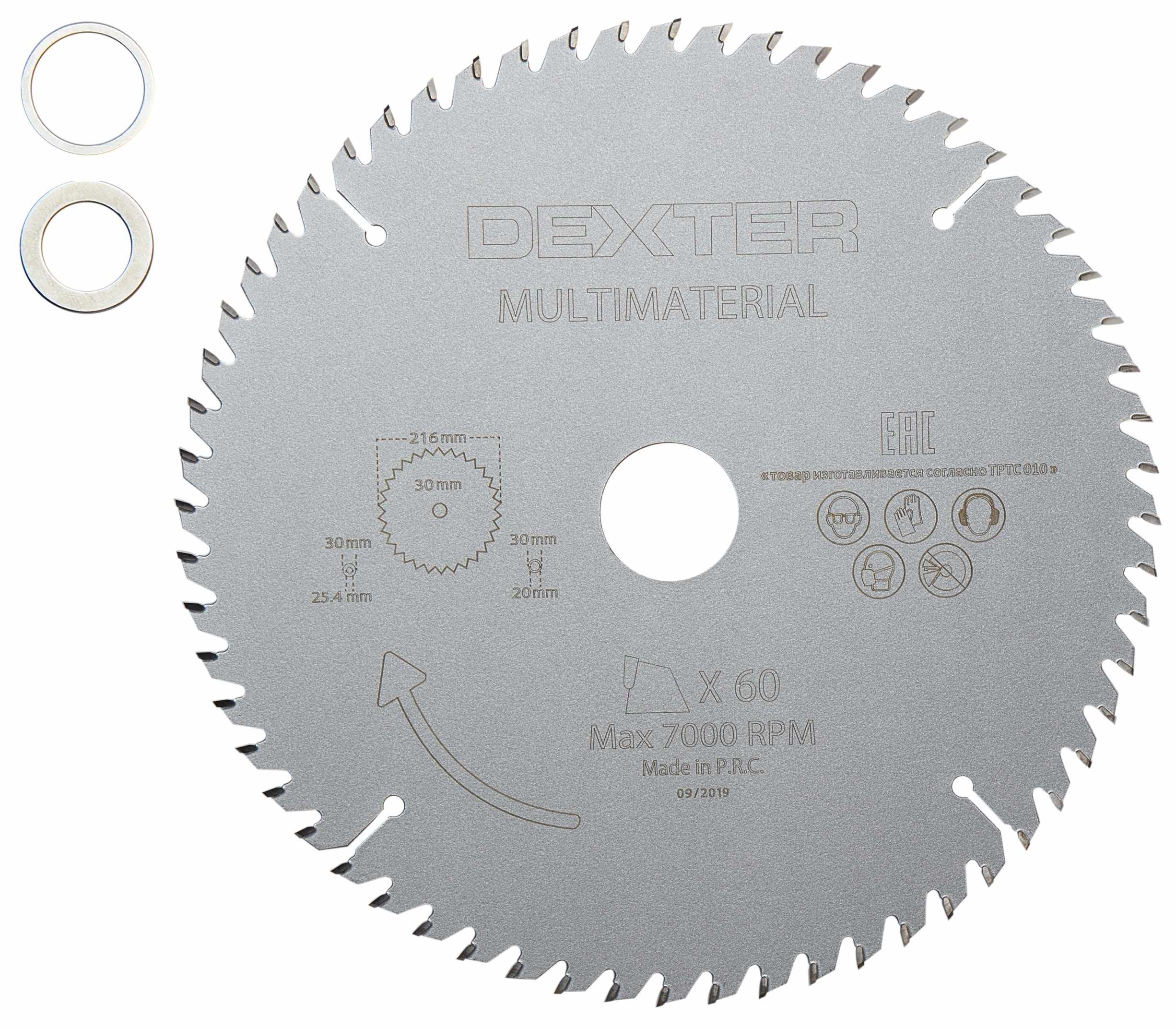 Характеристики Диск пильный универсальный Dexter FD-E052163060T 60Т 216x30x1.5 мм, кольца: 20 и 25.4: