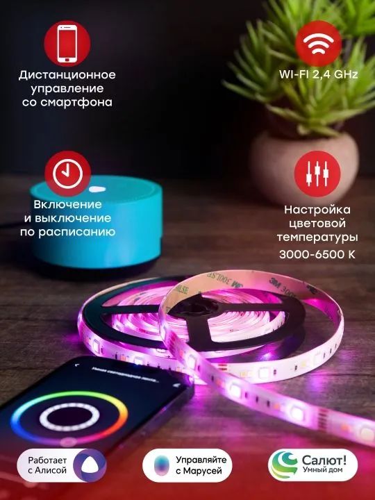 В комплект поставки входят светодиодная лента на клейкой основе, пульт управления, WI-FI контроллер, блок питания и подробная инструкция по установке и эксплуатации.