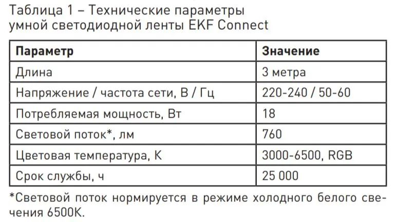 Лента работает от однофазной цепи переменного тока номинальным напряжением 230В и частотой 50Гц. Для ее работы требуется наличие беспроводной сети Wi-Fi с частотой 2,4 ГГц и выходом в сеть Интернет. Управление лентой осуществляется с любого устройства на базе операционной системы Android 4.4 / IOS 8.0 или выше. Для этого необходимо установить приложение EKF Connect.