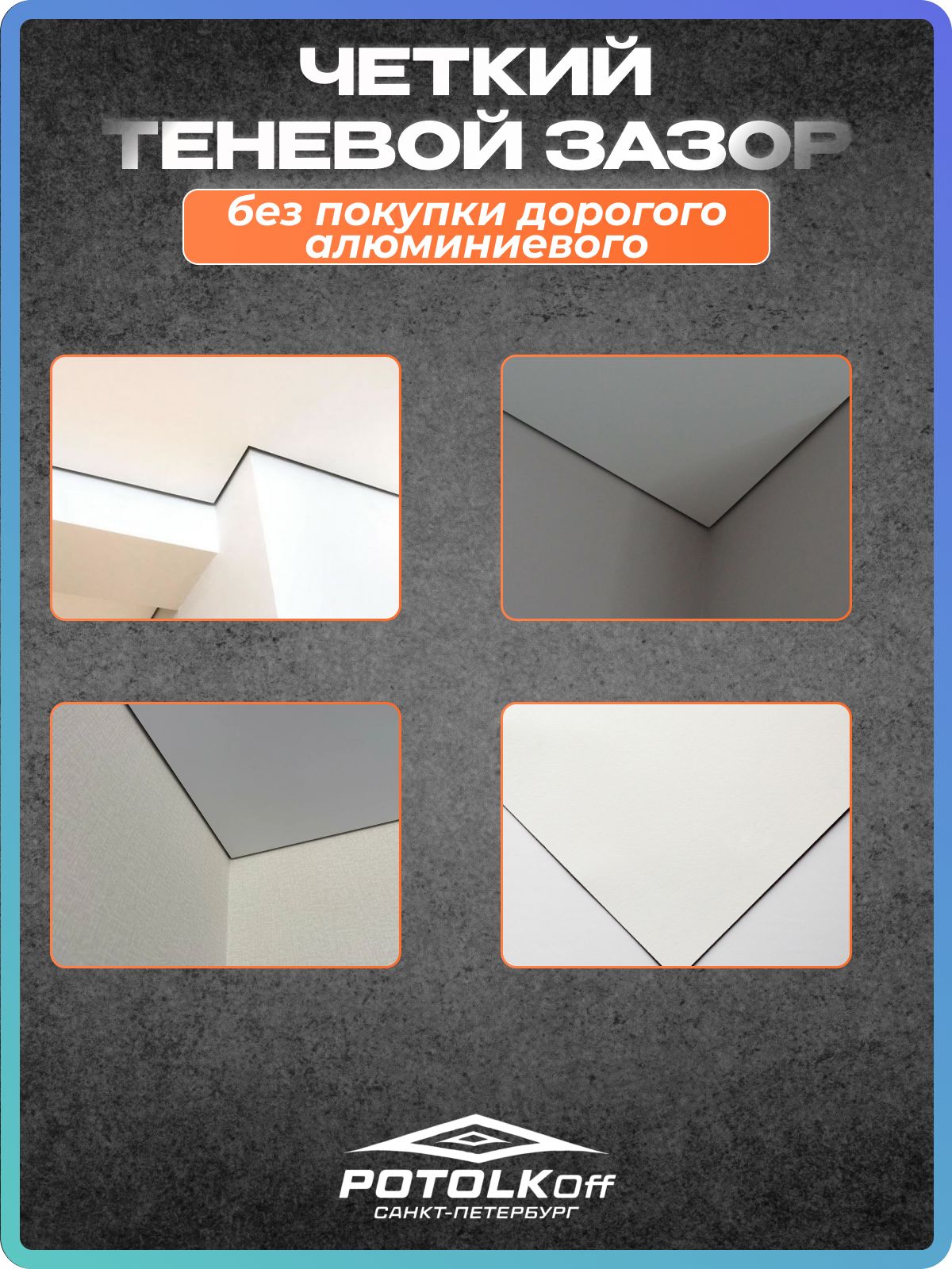 Профессиональный теневой профиль ПВХ премиального качества для безупречного монтажа натяжных потолков. Черный матовый цвет создает аккуратный теневой зазор, полностью скрывая крепежные элементы.